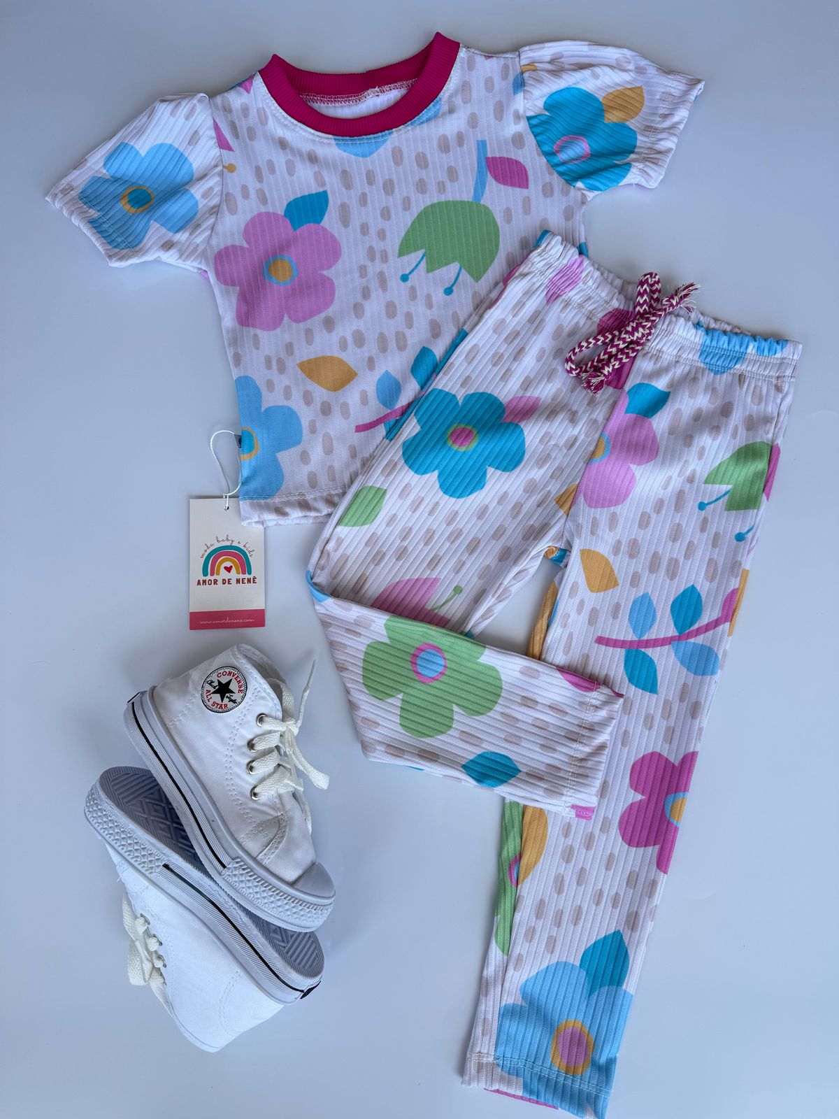 Conjunto composto de blusa e calça legging em malha canelada de poliester. Não possui toque de algodão.