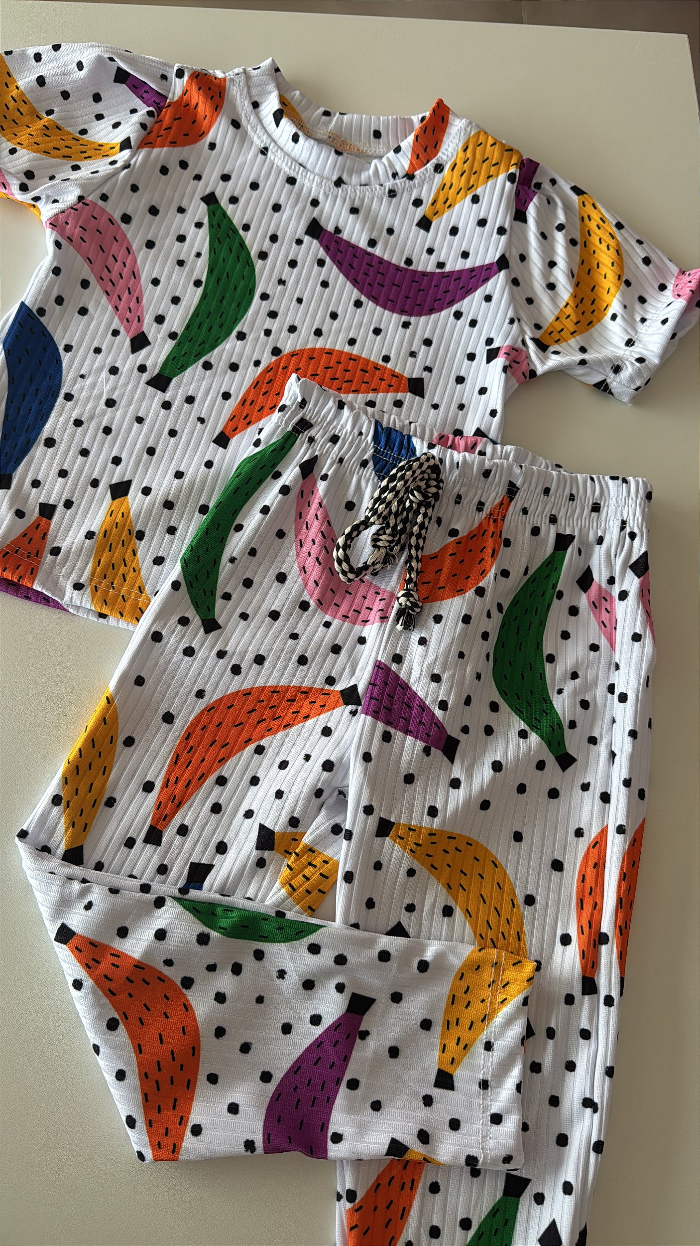 Conjunto composto de blusa e calça legging em malha canelada de poliester. Não possui toque de algodão.