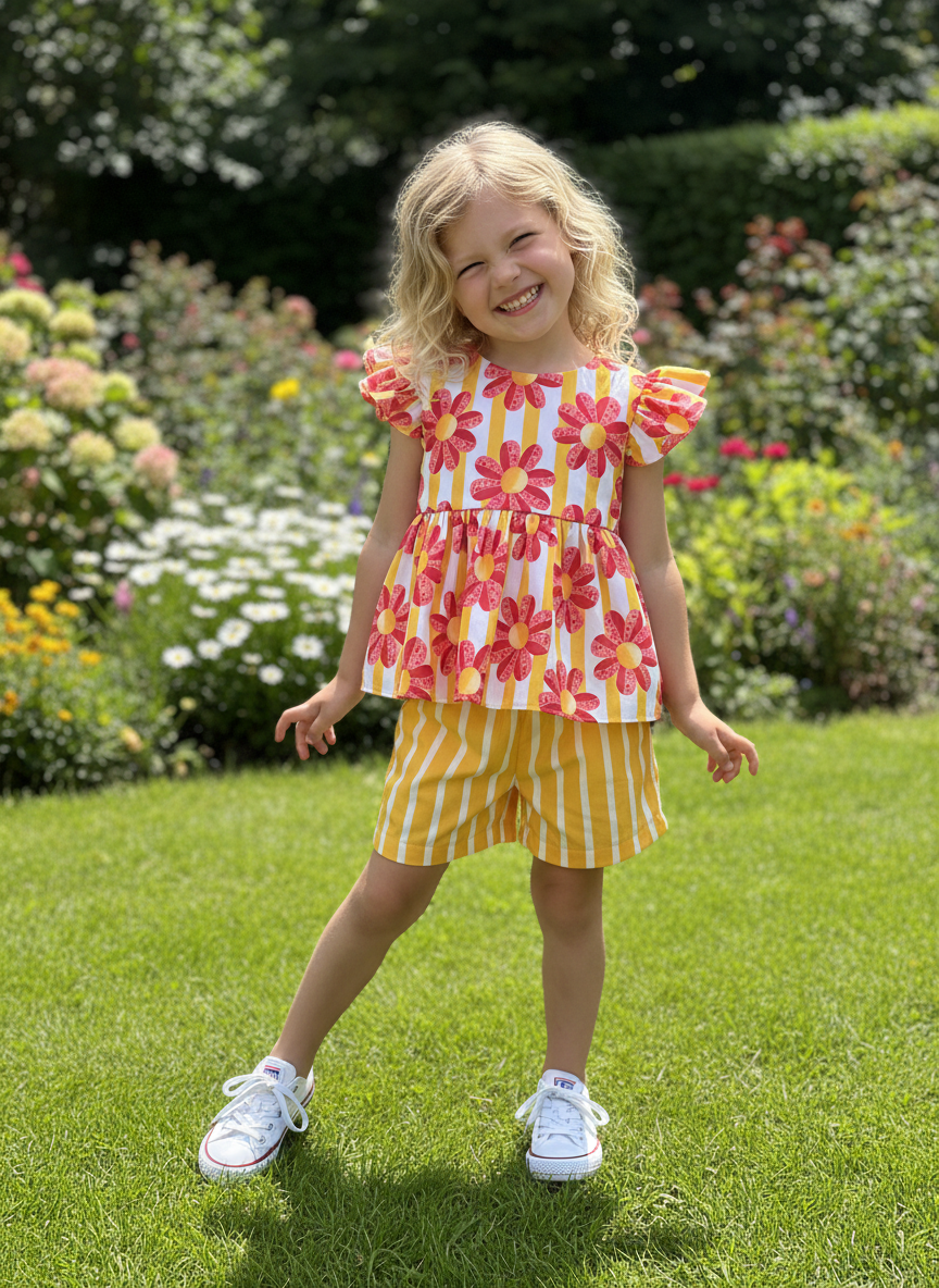 Conjuntinho composto de batinha com fechamento traseiro em ziper, ombrinhos com detalhe em frufru e short com elástico na cintura.