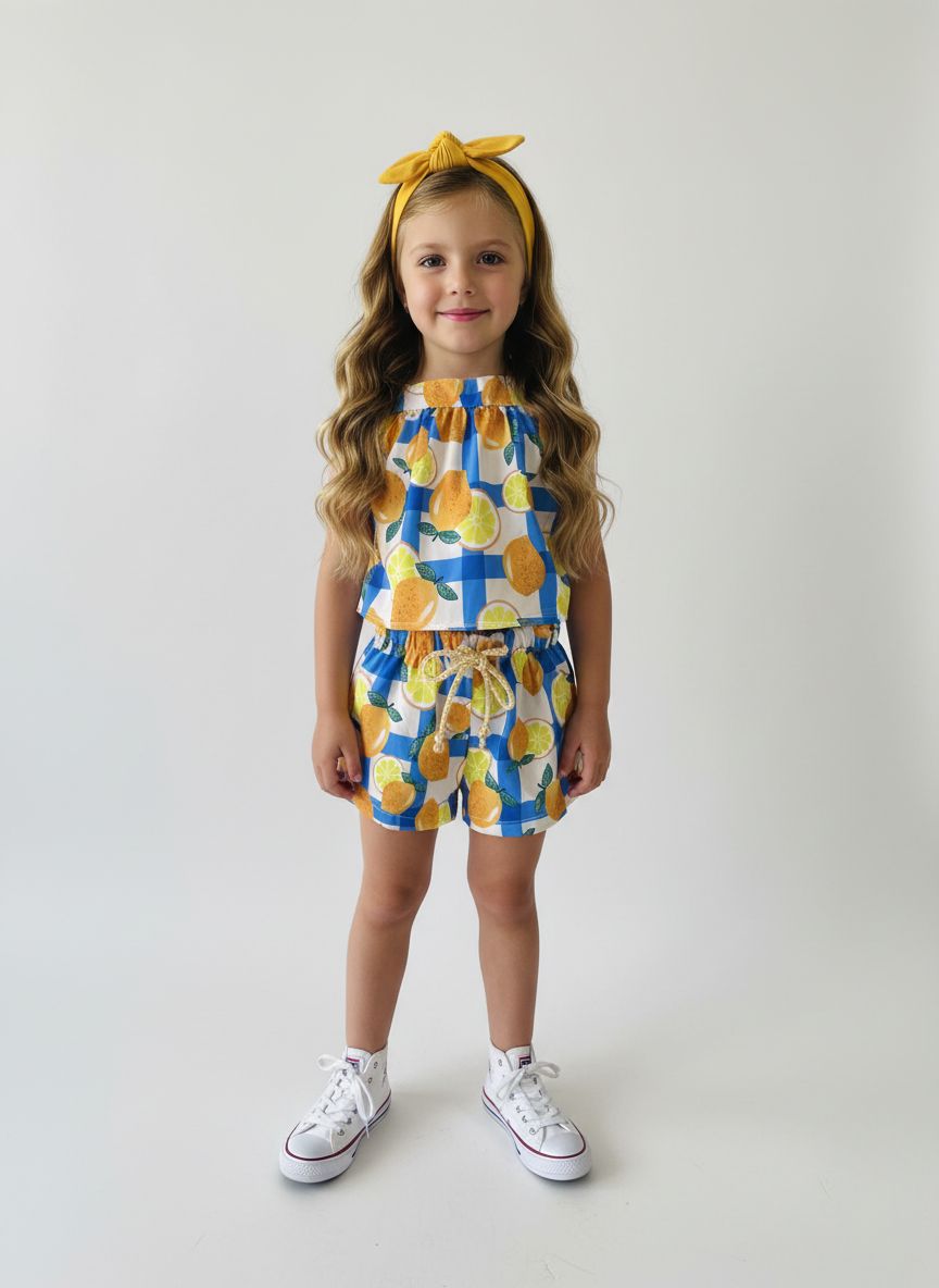 Conjuntinho composto de batinha com alcinhas de amarração em cordinha de algodão e shortinho com elástico.