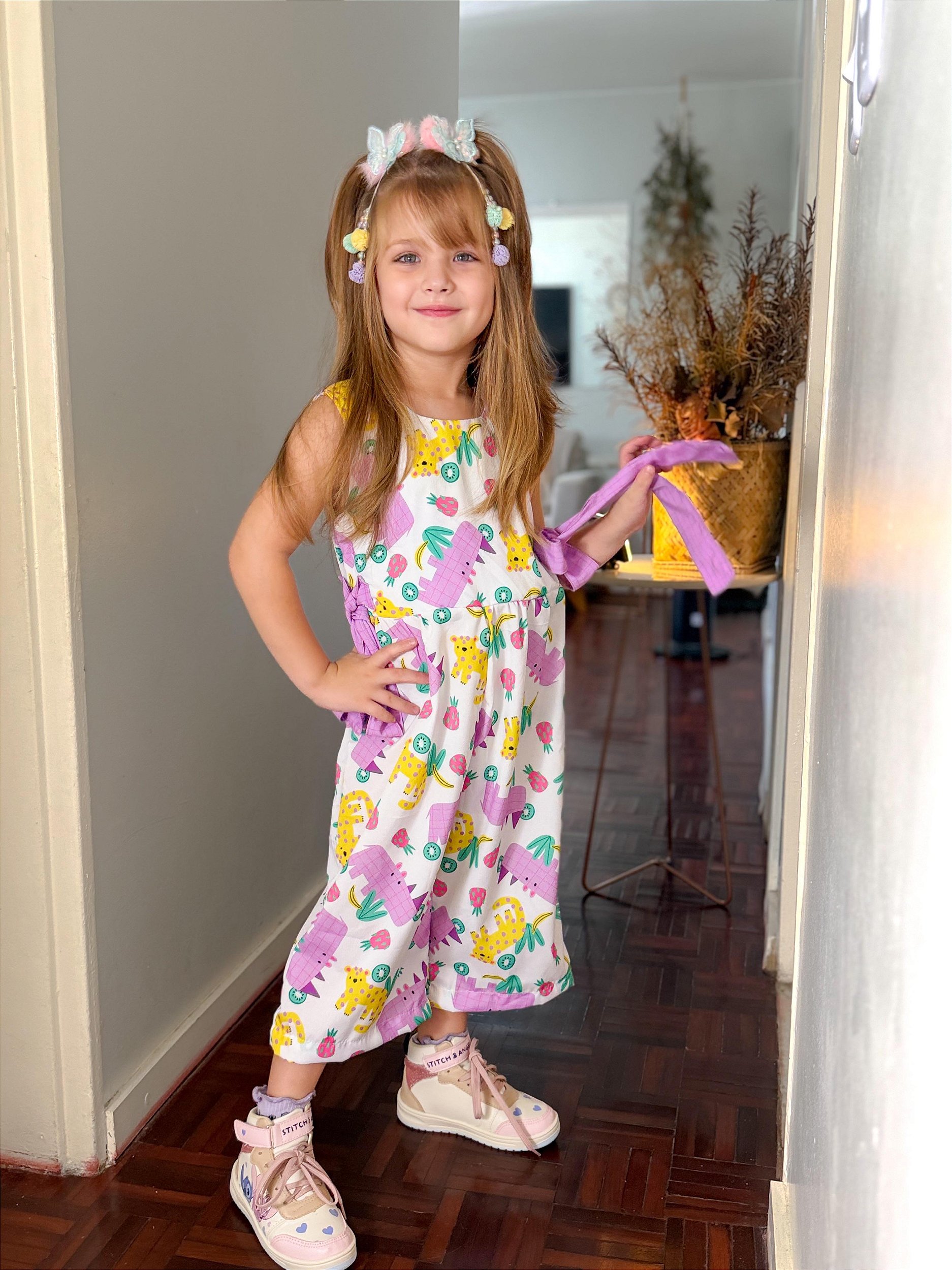 Macacão estilo pantacourt, bem soltinho com fechamento traseiro em ziper.
