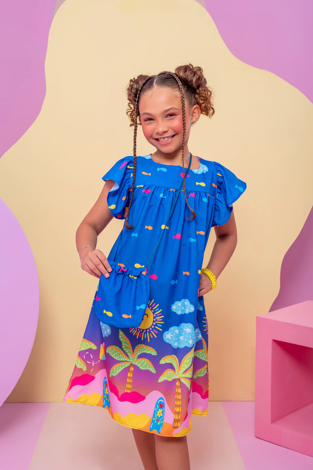 A modelagem soltinha proporciona um caimento delicado e charmoso, ideal para acompanhar as meninas em momentos de diversão e estilo. E para deixar a peça ainda mais especial, o vestido acompanha uma linda bolsinha com a mesma estampa, perfeita para completar o visual com muito charme.